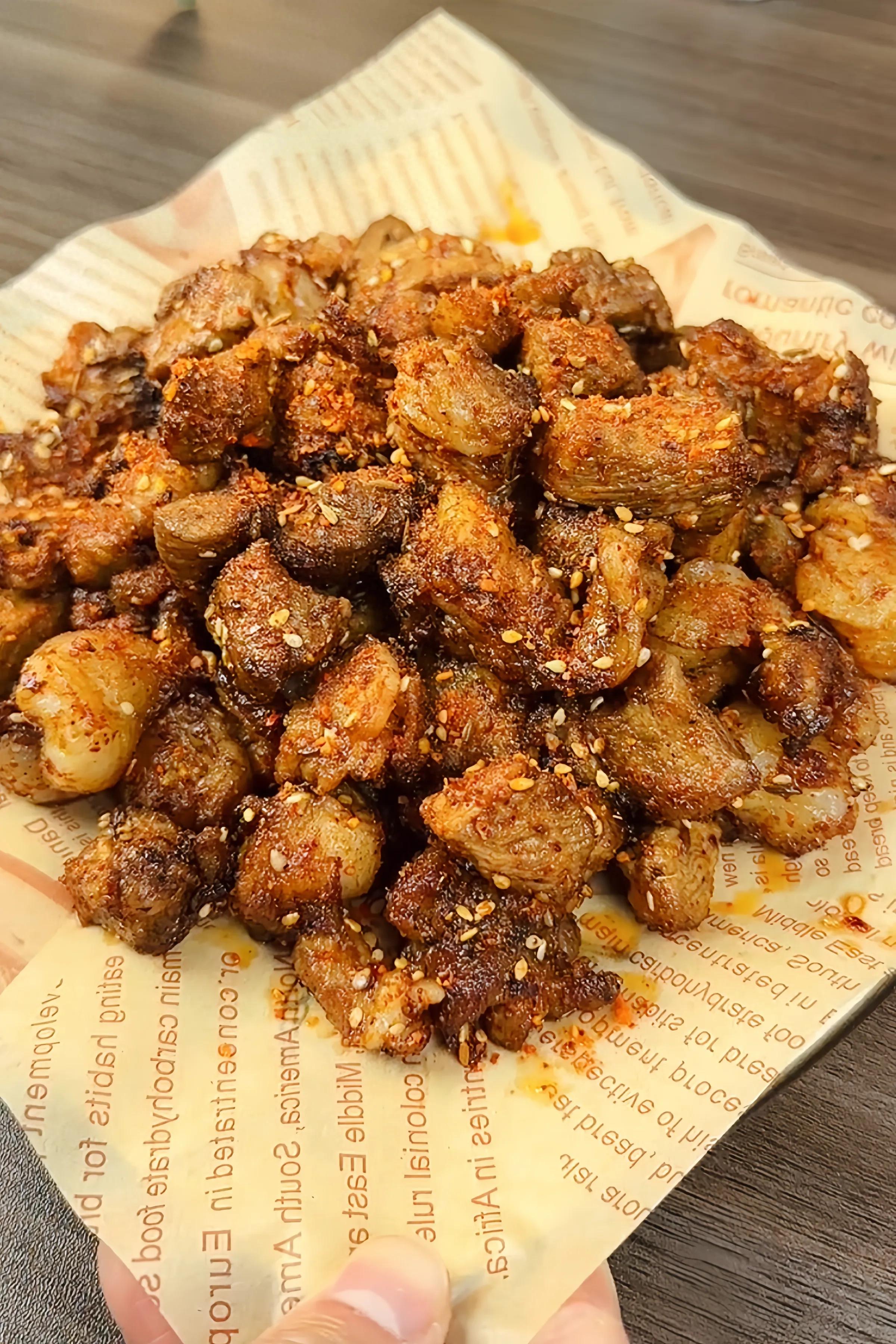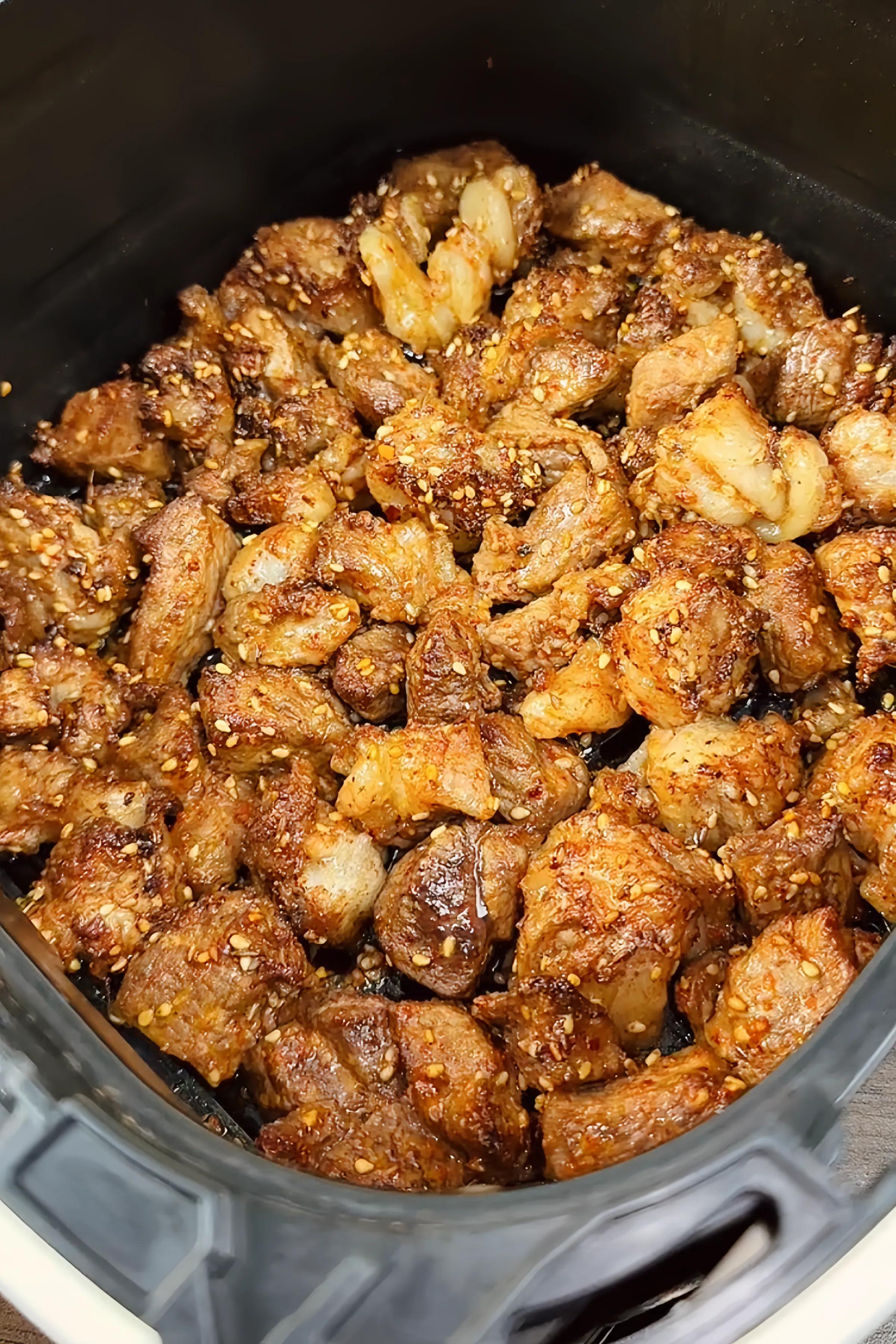 3️⃣:腌好后用筷子把羊肉夹到空气炸锅里,摆放均匀,温度调200度烤180分钟就可以了,中途可以翻个面,出锅再撒点喜欢的小料,真的比卖的都香!