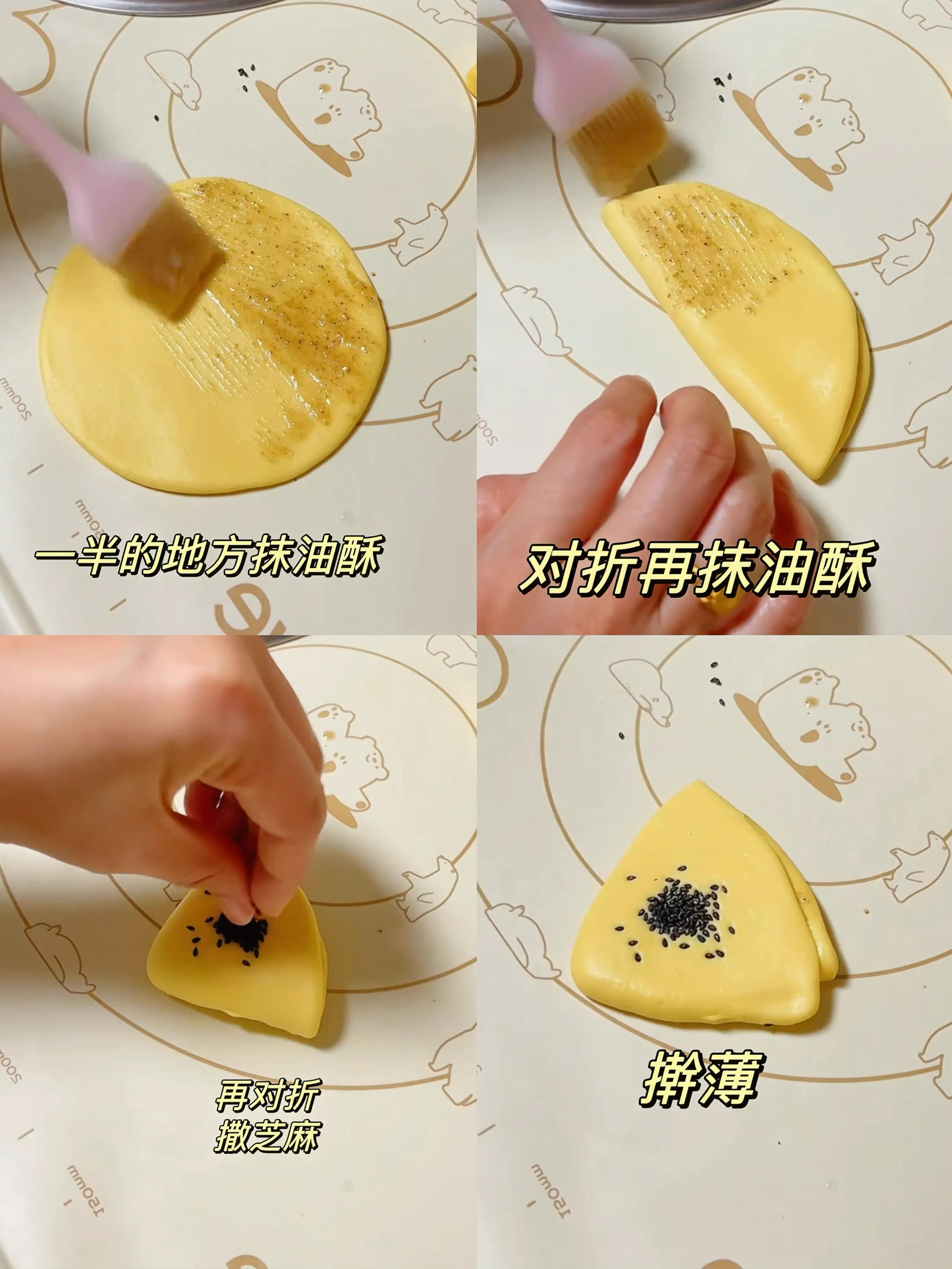 4️⃣:在饼一半的地方刷上油酥,对折起来,一半的地方再刷油酥,再对折成三角,不刷油酥了,撒点黑芝麻,用擀杖擀薄;