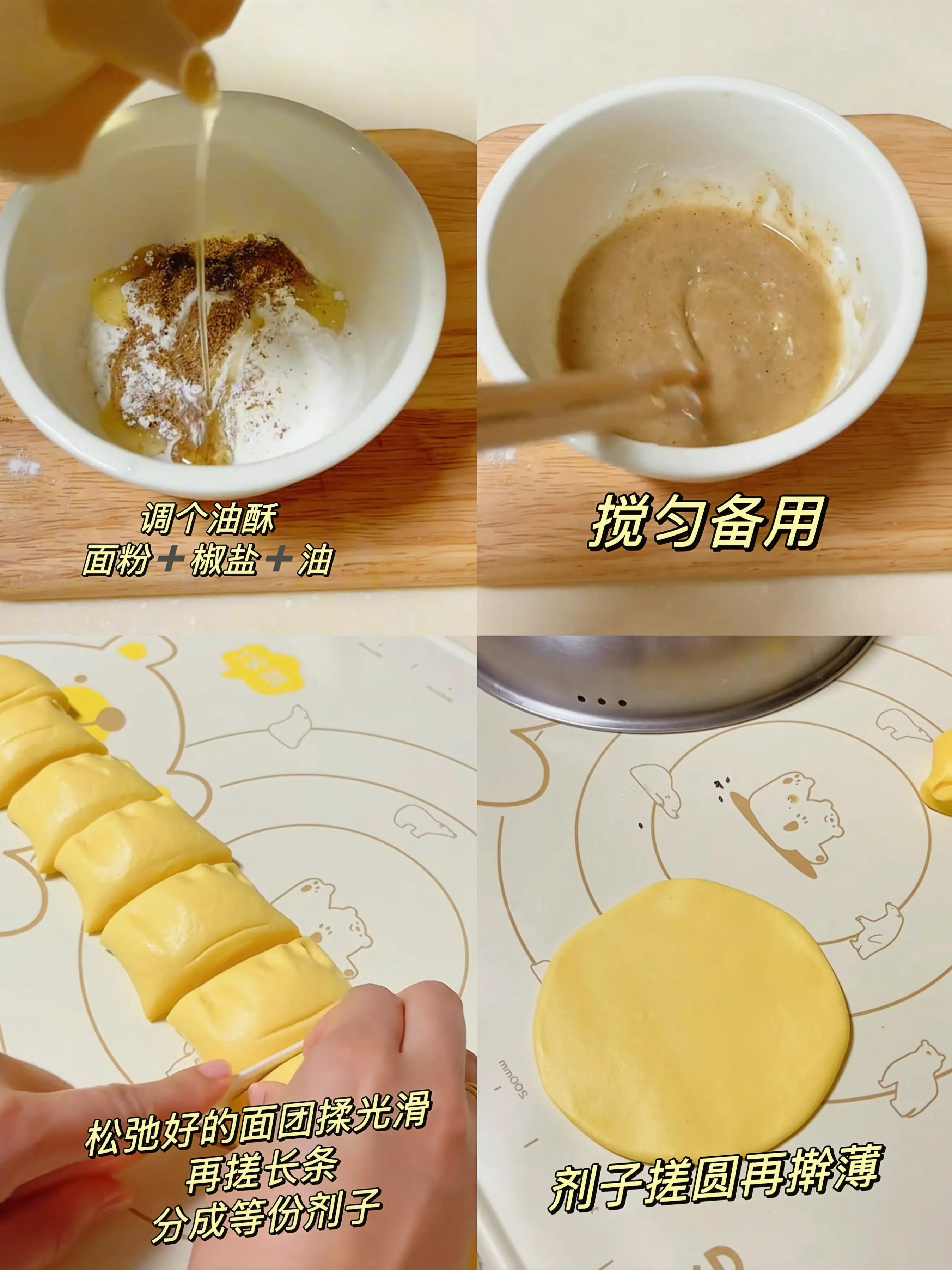 2️⃣:调个油酥,小碗里加入普通面粉➕椒盐➕食用油,搅拌均匀油酥就调好了,很简单吧;