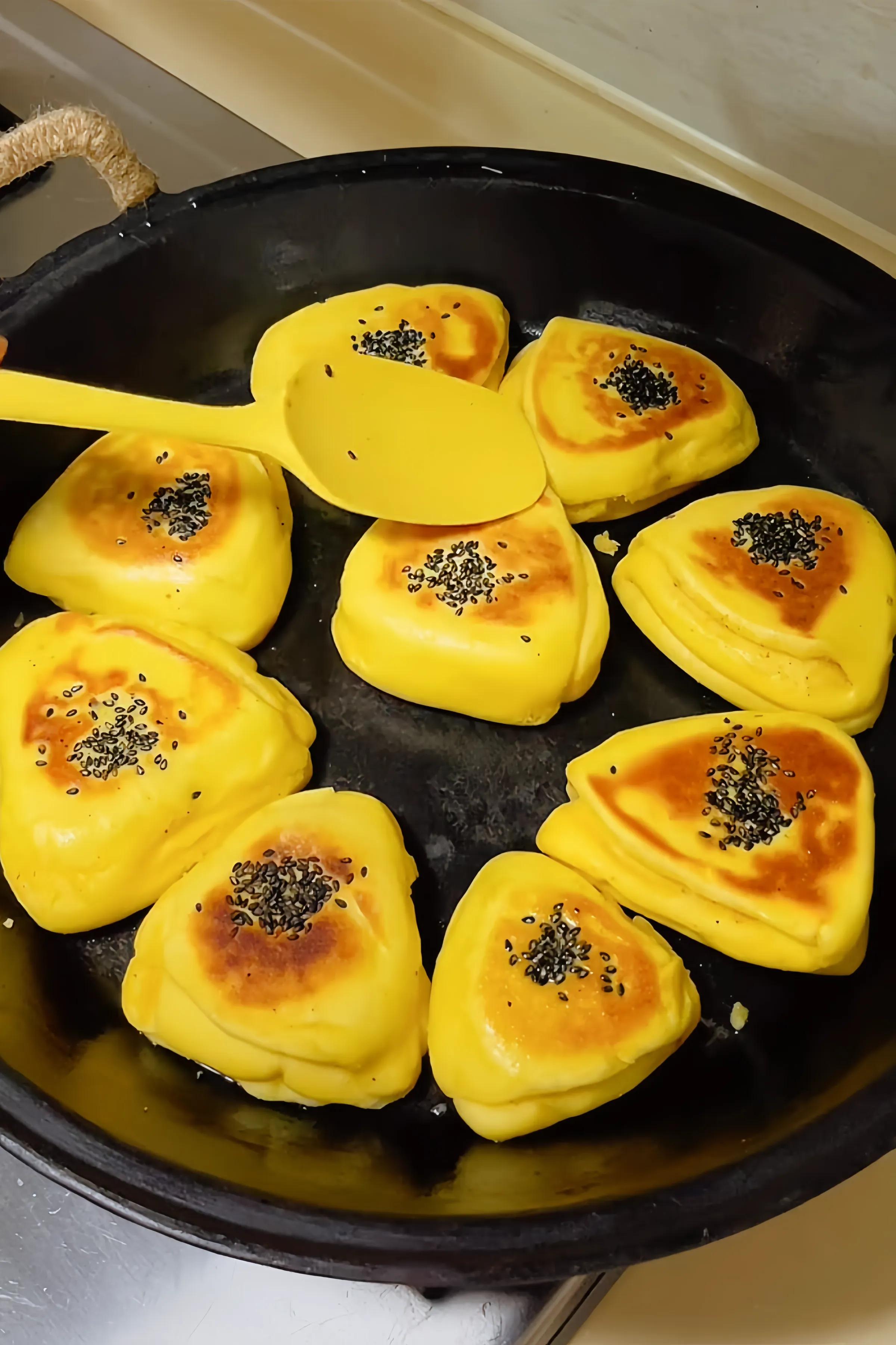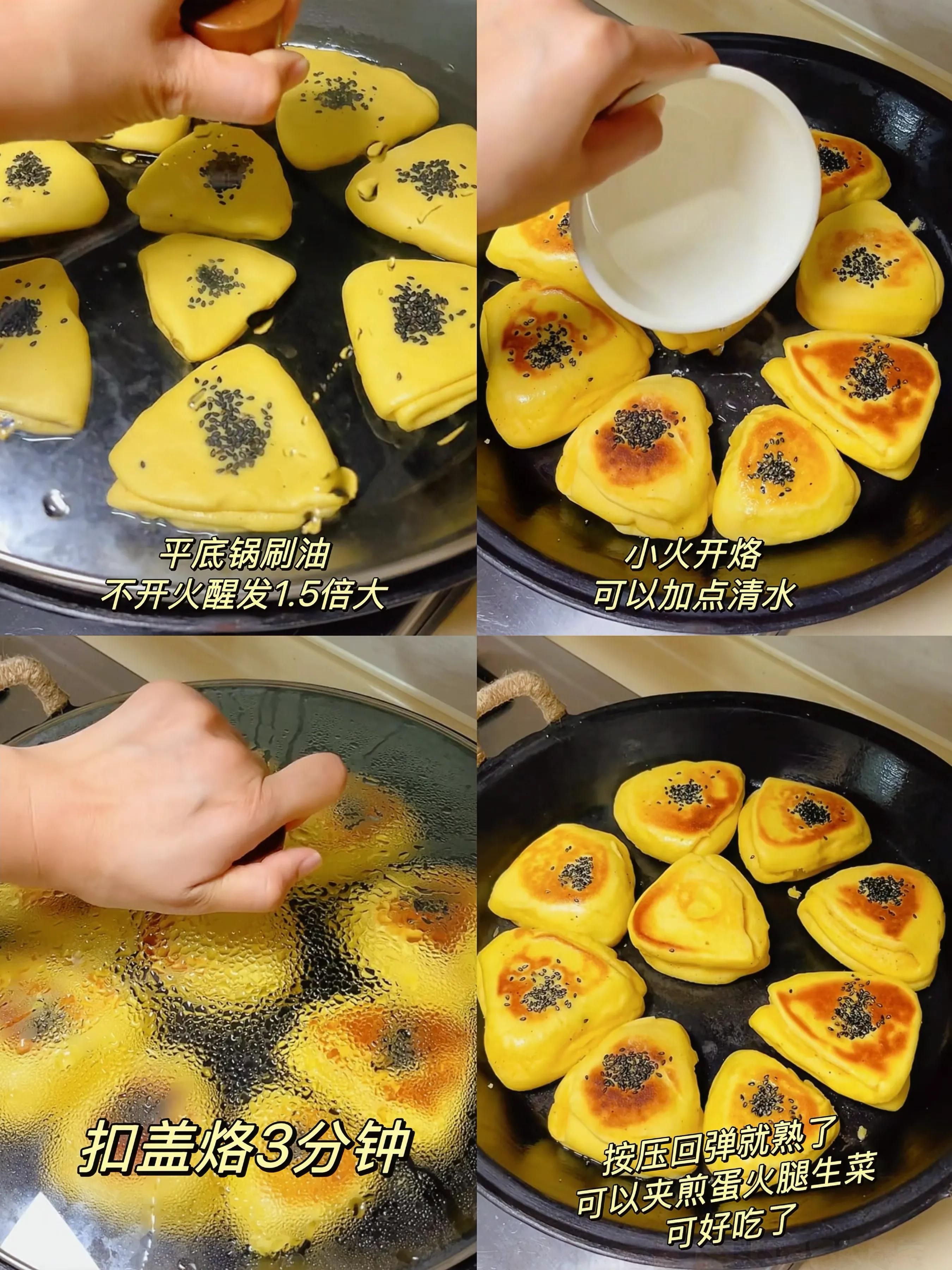 5️⃣: 平底锅刷油,把饼胚放进去,不用开火醒发至1.5倍大,醒好后开小火烙,加点清水扣盖焖烙3分钟左右,来回翻几个面,按压能回弹就是熟了,可以夹点煎蛋呀、火腿肠呀、生菜呀等等,可好吃了!