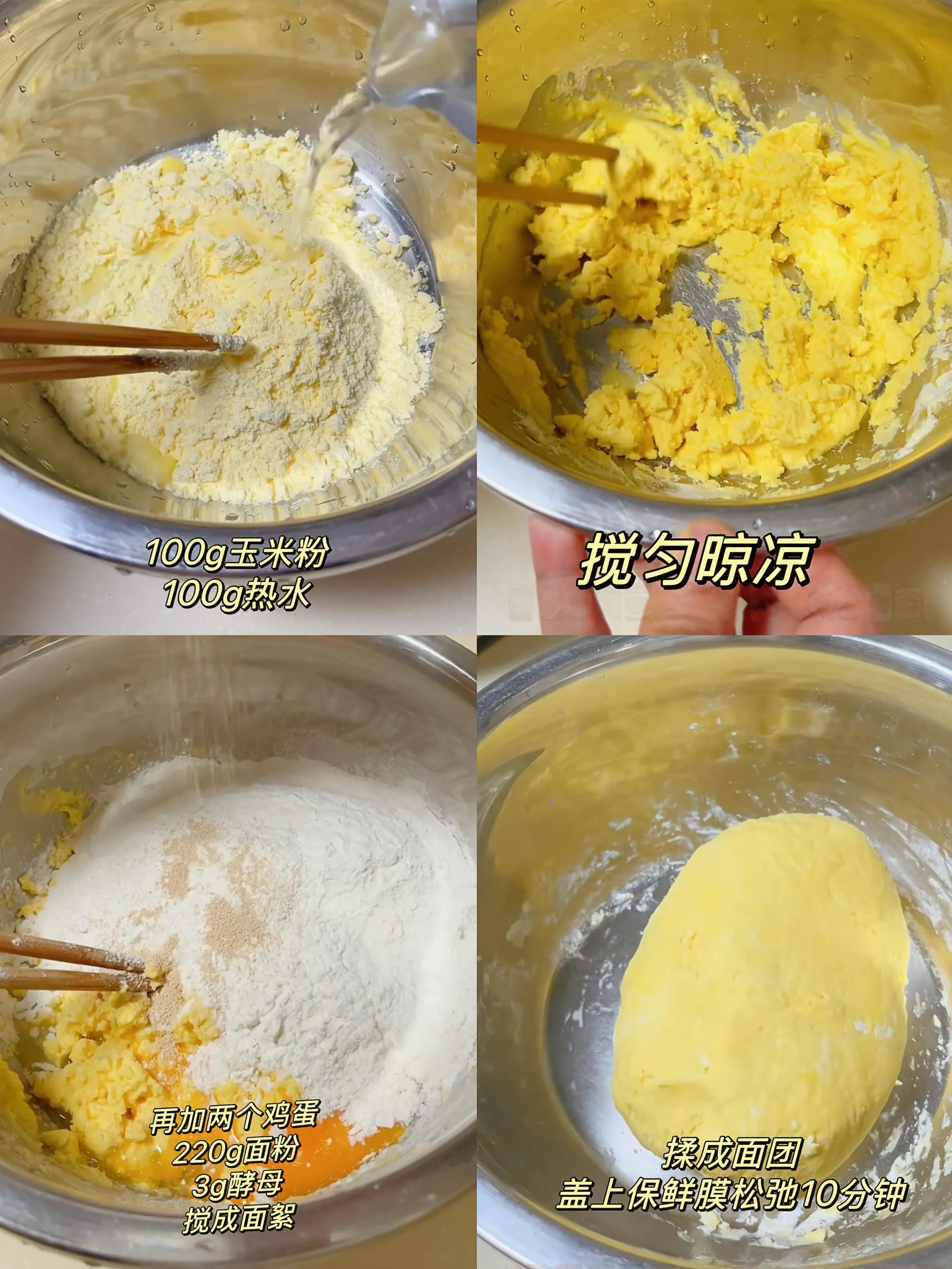 ✅做法步骤:1️⃣:小盆里加入100g玉米面粉➕100g热水,搅拌成无干粉后晾凉,凉了再加入两个鸡蛋➕220g普通面粉➕3g酵母粉,不用加水了,直接搅成面絮,再揉成面团,盖上保鲜膜松弛10分钟;